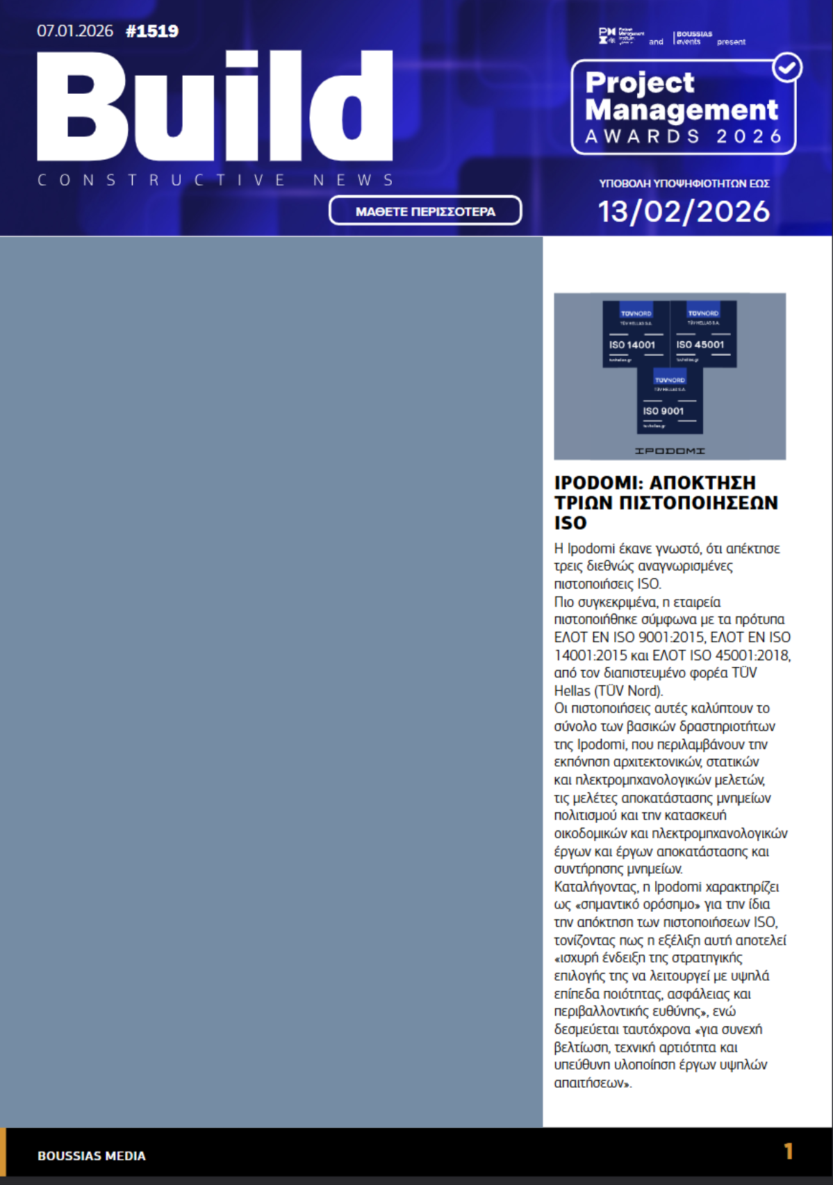 Η IPODOMI φιλοξενείται στο περιοδικό Build – Constructive News (Boussias Media), σε δημοσίευση που αναφέρεται στις πρόσφατες πιστοποιήσεις ISO της εταιρείας και στη συνολική της προσέγγιση ως προς την ποιότητα, την ασφάλεια και τη συμμόρφωση με διεθνή πρότυπα.
